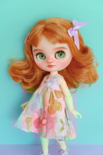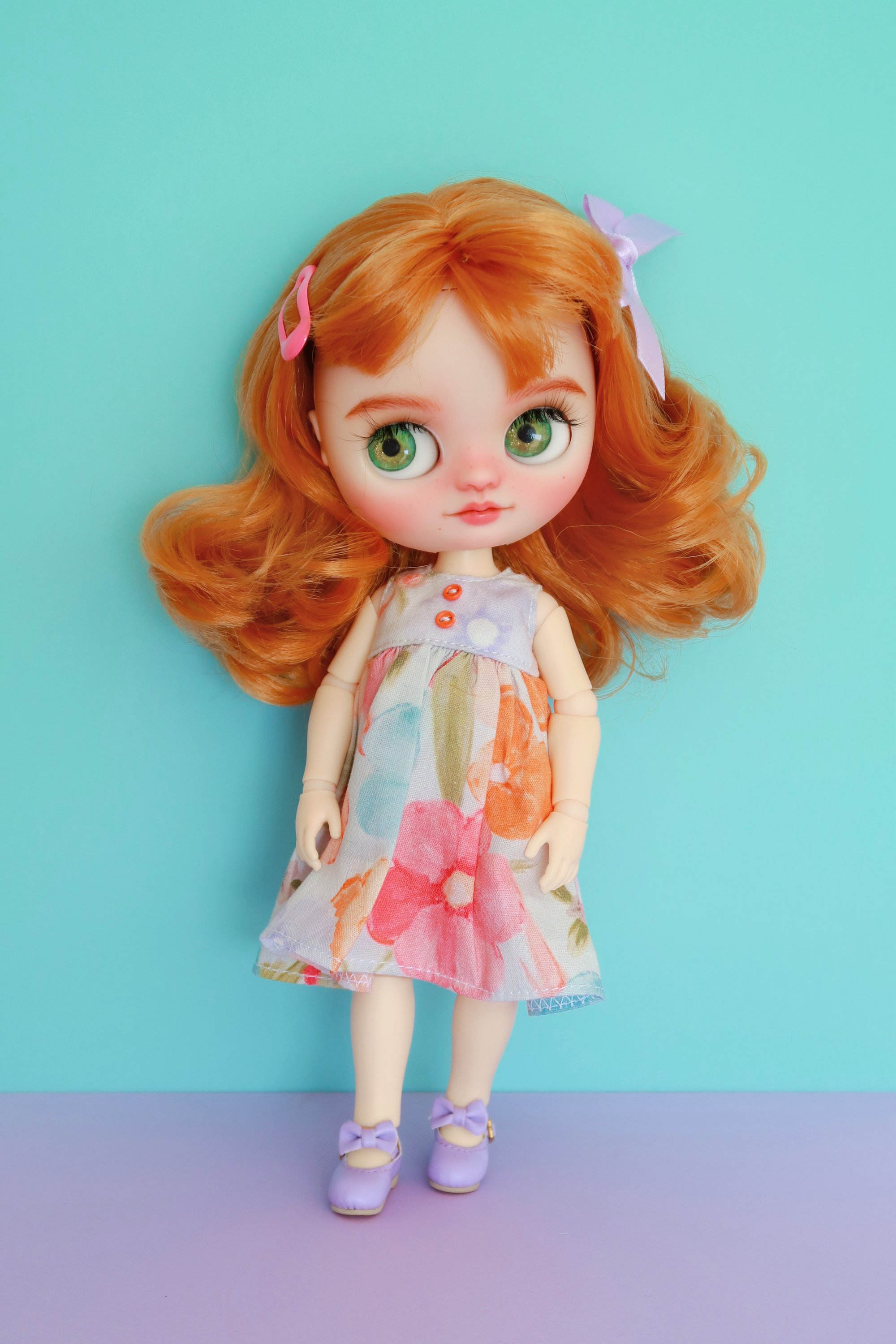 Most Neo Blythe (full-sized) tops, dresses, and shoes will fit her body. Her pants and other regular clothing size is 1/8 or 20cm BJD size.